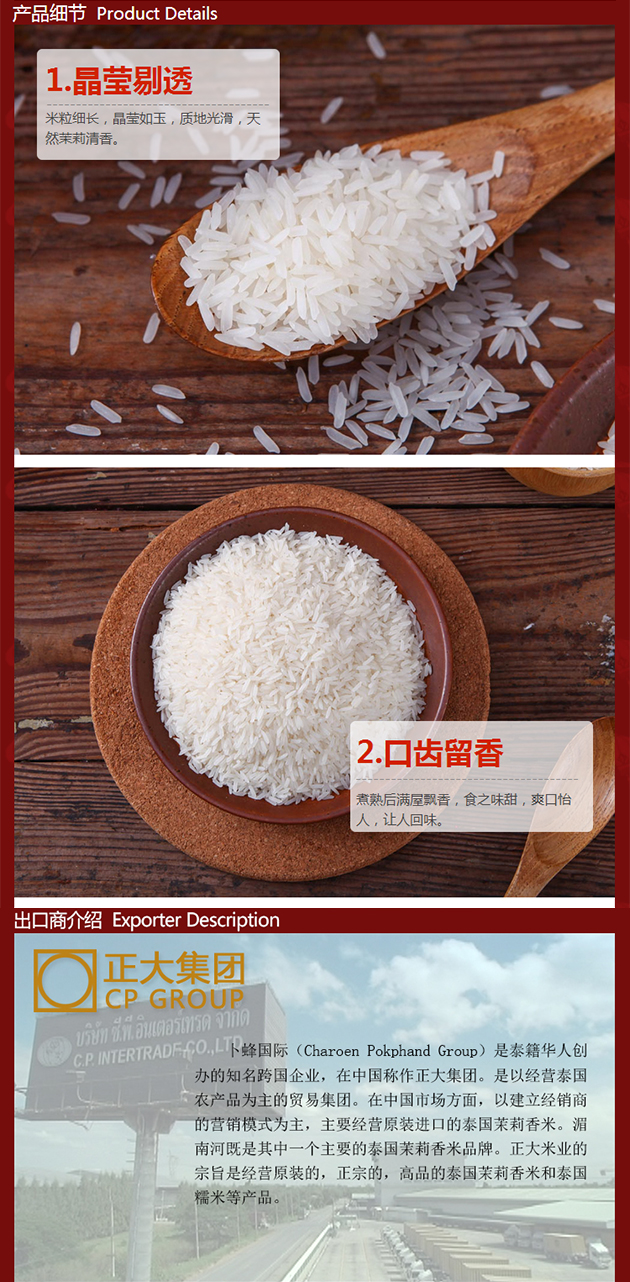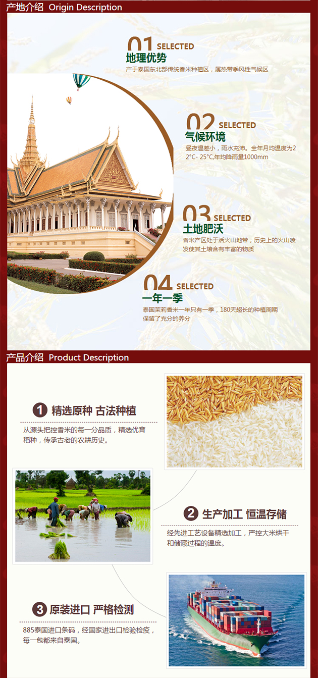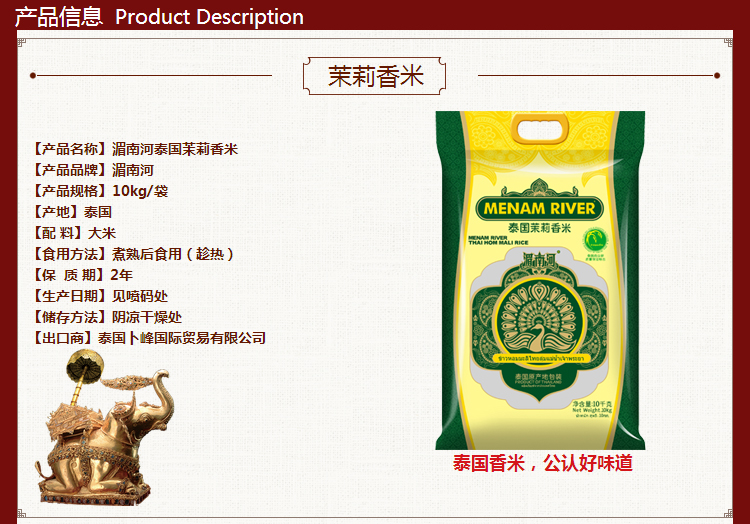 產(chǎn)品描述:湄南河泰國茉莉香米精選泰國珍貴原種,堅持地道正宗。產(chǎn)自泰國東北部,土地肥沃,生態(tài)環(huán)境優(yōu)美,氣候條件得天獨厚,適合優(yōu)質(zhì)香米生長。水稻專家全程監(jiān)督指導,嚴格限定農(nóng)藥、化肥的使用,革新栽培技術(shù)。經(jīng)世界先進工藝設(shè)備進行加工,嚴格控制大米烘干、精選、儲藏過程的問題,保持大米新鮮度。包裝采用環(huán)保材料,附加內(nèi)膜保鮮技術(shù),確保大米從出廠到您手中都新鮮、芳香。